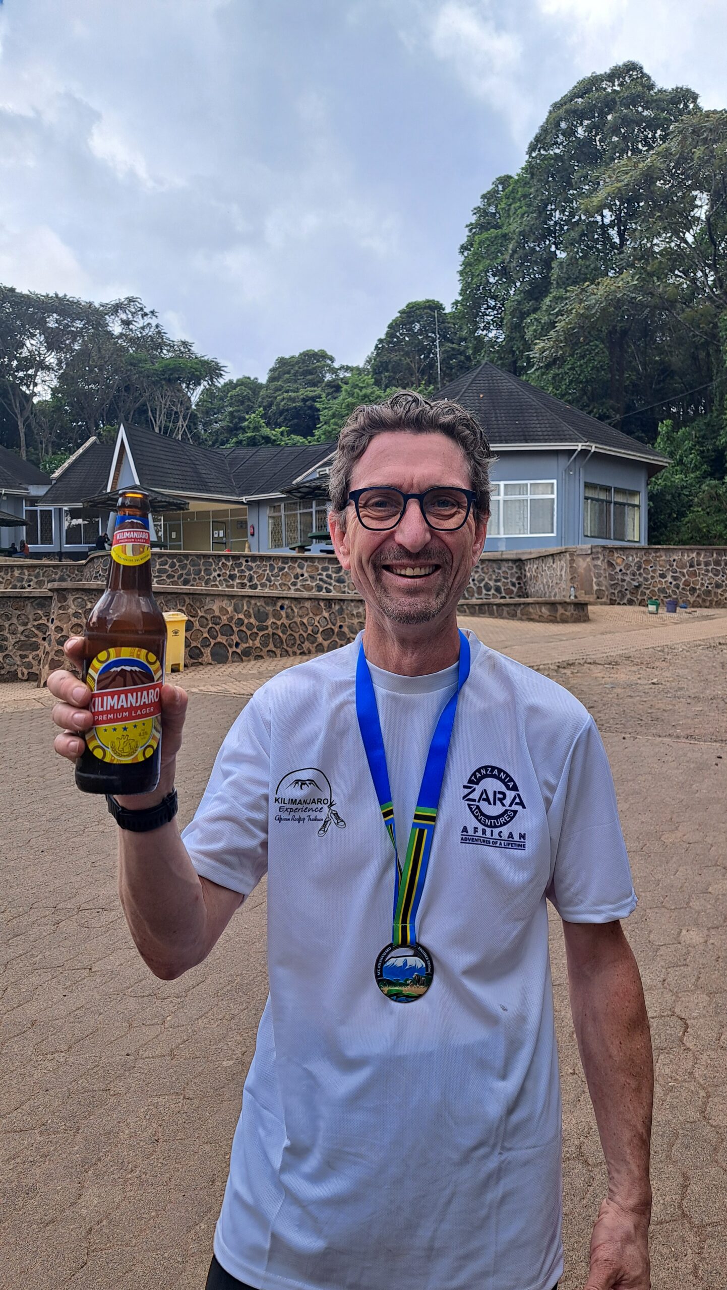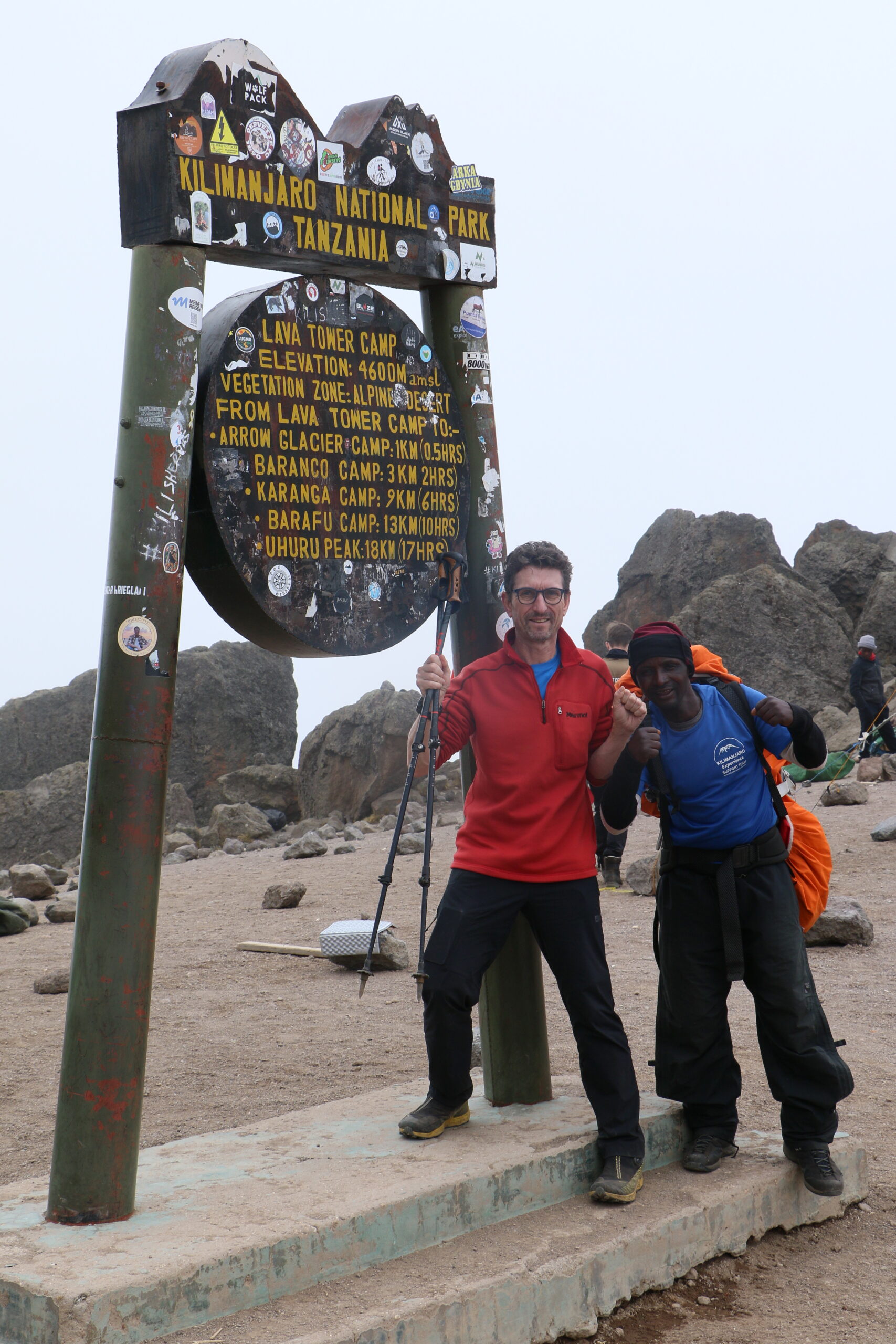 Na de top volgde nog een lange afdaling langs de andere zijde van de berg. Tot aan Barafu Camp op 4.673 meter hoogte betreft het een steil stuk met veel los gesteente. “Dat eerste deel is een stuk vol steenpuin waar je, mits wat ervaring en durf, kan schuiven om sneller te dalen. Daarna volgt een zeer lange afdaling naar de gate op 1.800 meter.”